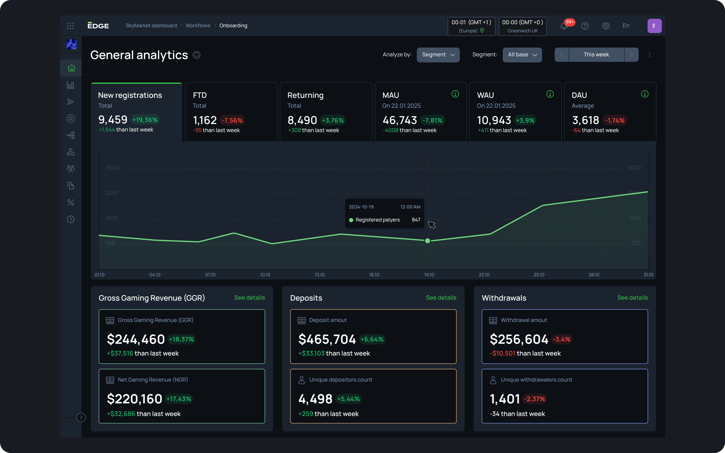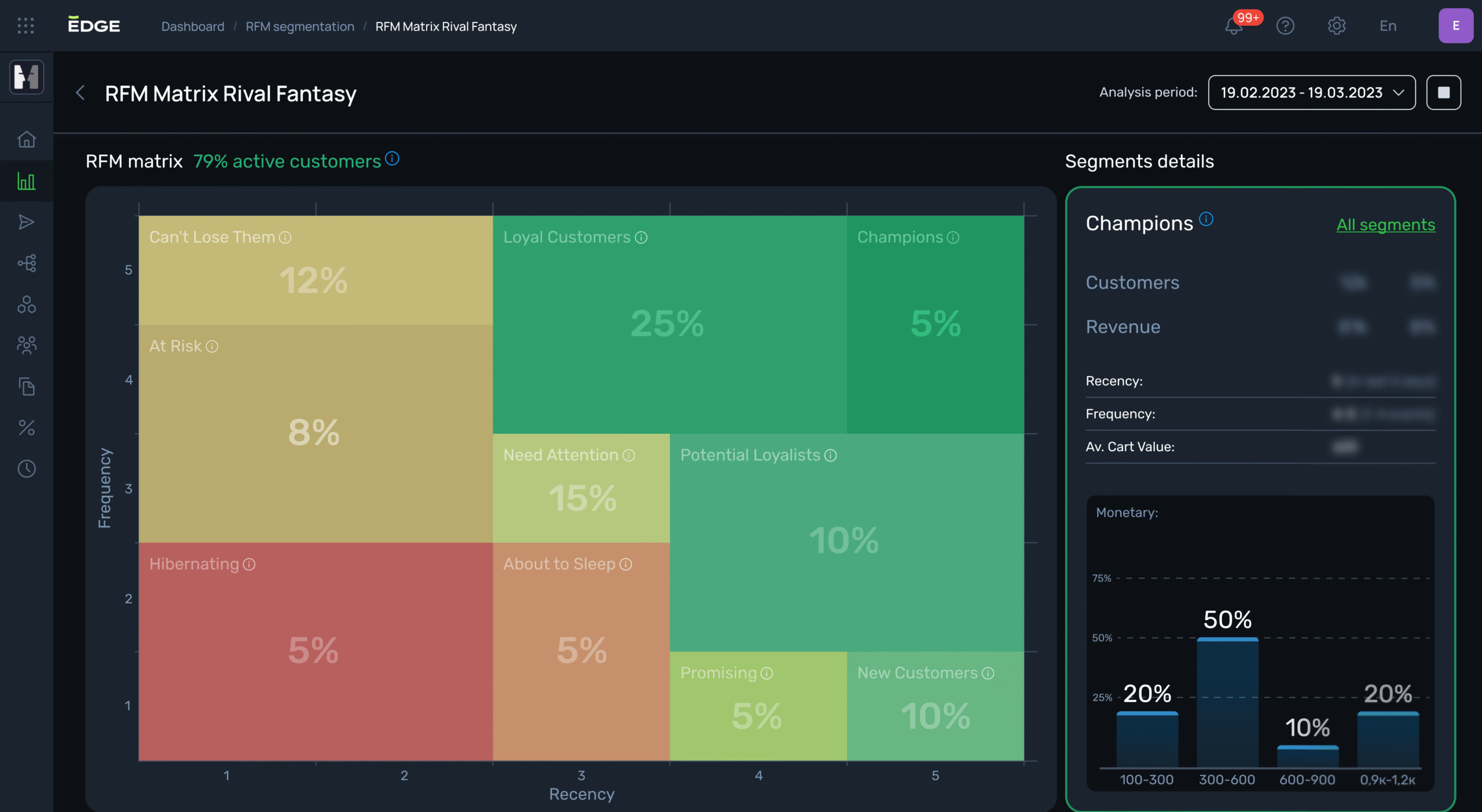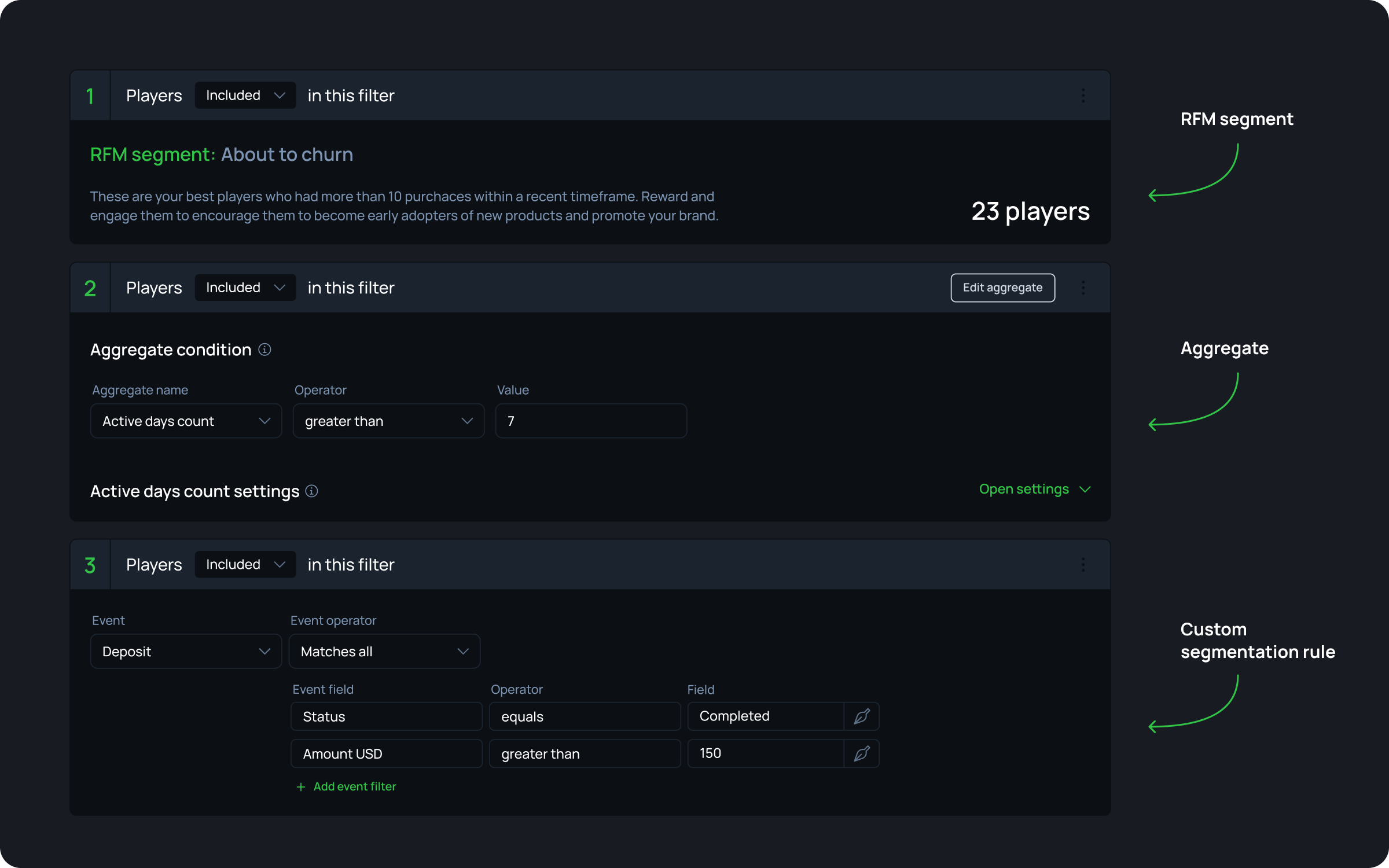 Target players using a variety of segmentation approaches. Leverage AI-powered RFM segmentation to identify high-rollers and low-stakes players. Tap into purpose-built aggregates for iGaming or set custom rules to segment users based on real-time activity, gaming preferences, or other behavioural traits.